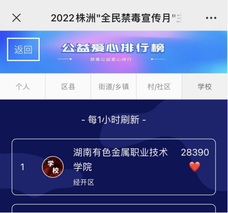 “您的好友邀请您观看株洲市禁毒委员会《告全民禁毒书》,接力公益爱心,共建无毒城市。”近日,由株洲市禁毒委员会办公室发起的“6·26”禁毒主题宣传活动在全市开展,学院已连续多日稳居活动实时排行榜学校类的榜首。