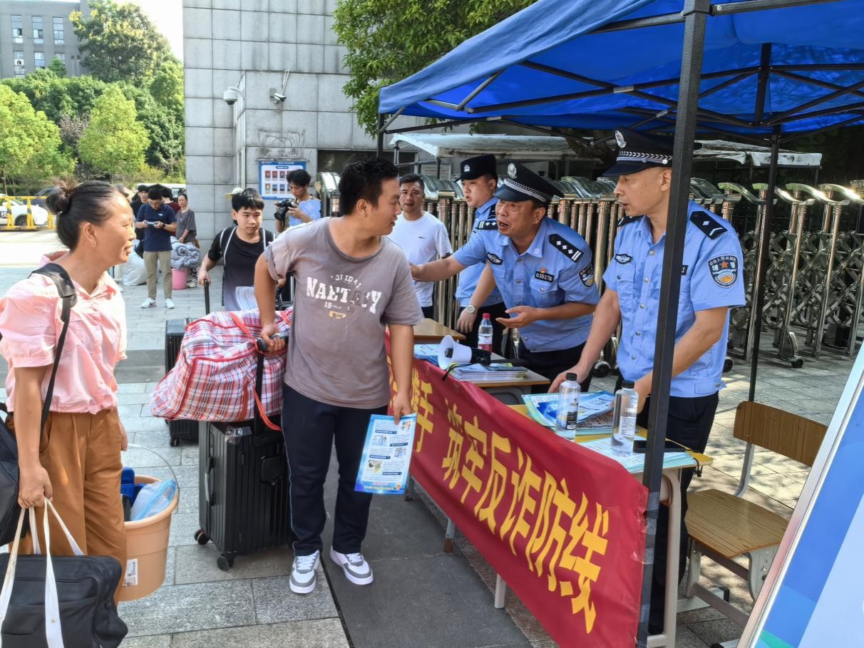 同时,学院还与辖区派出所、交警等单位联勤联防,共同维持校内及周边治安、交通秩序。校门口反诈宣传台处,警官们向入学报到的新生发放反诈宣传册,耐心提醒同学们要提升防骗意识。