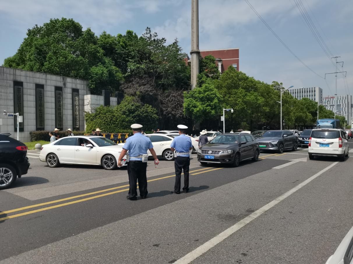 株洲市公安局云龙交警大队警官在校门口道路指挥交通