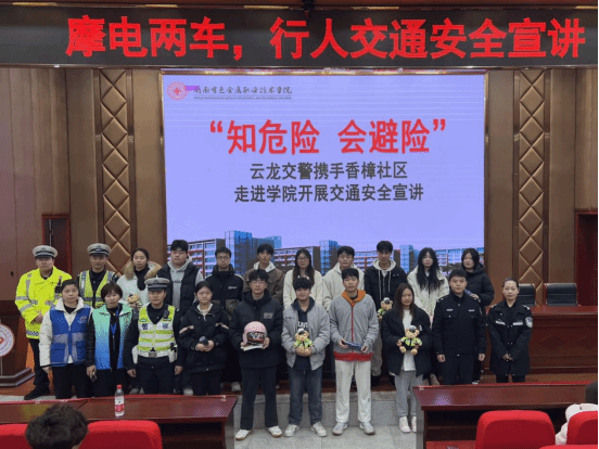 3月13日上午,学院学术报告厅内,一堂别开生面的交通安全课在此起彼伏的抢答声中展开。学院联合株洲市公安局交通警察支队云龙大队、株洲市石峰区学林街道香樟社区开展的“知危险 会避险”交通安全宣讲活动正在这里举行。当交警小熊、安全帽等礼物遇上00后大学生,这场交通安全教育突破传统说教模式,用沉浸式体验为360余名师生带来特别一课。