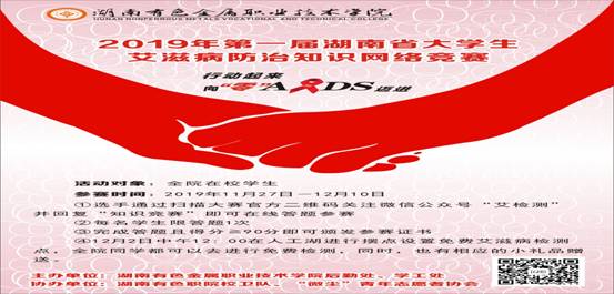 11月27日—12月10日,校后勤处、学工处、保卫处校卫队联合举办“2019年第一届湖南省大学生艾滋病防治知识网络竞赛”活动。”全院在校生用微信扫描竞赛专用二维码或关注公众号“艾检测”登录,登录后输入相关信息作答,成绩优秀者由官网自动生成荣誉证书并获得相应的奖项。