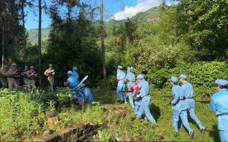 在茶陵湾里“红军村”,同学们开展沉浸式教学实践体验。大家一边参观红军村遗址,一边学习茶陵湾里红军村革命史、湘赣边区革命斗争史、茶陵革命先烈的英雄事迹等。在沉浸式实践任务中,同学们身着红军装“重走红军路”,演绎“红军作战”,穿越当年那段烽火岁月,仿佛感受到了革命先辈们的艰辛历程。在红军标语墙前,学生分组解读标语内涵,结合大学生思想实际讨论当代青年的职责使命。