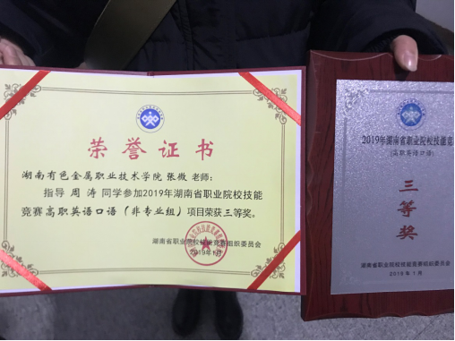最终,在2019年湖南省职业院校技能竞赛赛项高职英语口语大赛中,在院领导和各部门的大力支持下,在基础课部领导、人文教研室的悉心关怀下,张微老师指导学生周涛克服种种困难,荣获三等奖!在参赛的56所学校中,选手发挥敢于胜利的精神,取得第25名的成绩,击败了全省31所学校,同时比去年提升了8个名次。(供稿:亦岚)