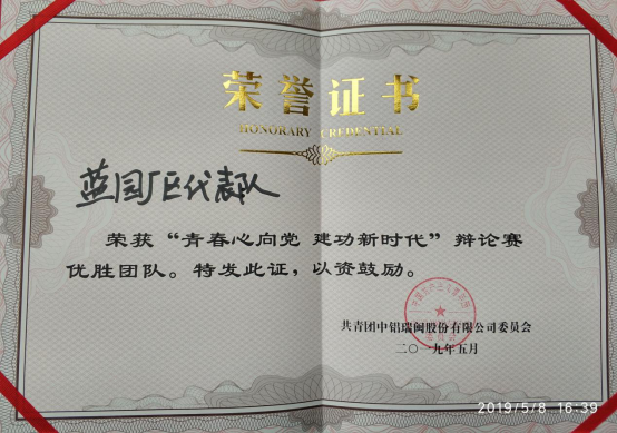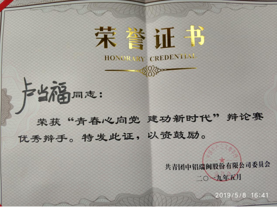 正值五四运动100周年之际,2019年5月8日下午,中铝瑞闽股份有限公司举办了纪念五四运动100周年表彰大会暨青年辩论赛活动。青年辩论赛是由蓝园厂区代表队和马尾厂区代表队进行对战,此次辩论赛代表蓝园厂区代表队出战的四名辩手,全部来自有色职院冶金材料系的毕业生,他们分别是稀土1501班卢当福、材料1501班龚亚萍、材料1502班李山园和稀土1601班邓永胜。在此次激烈的辩论赛中,他们以沉稳踏实的台风,条理清晰的思路,慷慨激昂的辩词获得了在场的公司领导以及评委们的一致认可,最终他们以优异的表现,赢得了此次辩论赛的第一名。