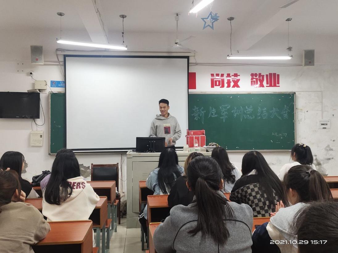 在会上,一些班助和参加比赛的成员也上台发言,畅谈军训工作的感受。辅导员彭安老师也上台给大家提出了殷切希望和谆谆嘱托,她指出:“新生军训是进入大学的第一堂课,意义非凡,很高兴大家都能为之努力过,我们有成绩,也有不足,在今后的学习生活中,一定要做好规划,并逐步去实现自己的人生目标”。班助代表说到:“从开始进校园的懵懂到现在目标明确,见证了他们在军训期间的坚强、执着、有骨气;见证了他们头发和衣襟被打湿的样子、被冷风吹的手在衣服里瑟瑟发抖的样子、长时间保持一个动作手腿抽筋的样子、不会的动作一遍接着一遍练的样子,这些都是他们的改变和进步;合唱与拔河我们班参加的人也很积极,看到他们的获奖照片满是欣慰,觉得我们的付出很值!”。