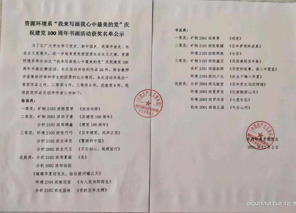为庆祝建党一百周年,加强学生的爱国主义教育和对中华民族优秀文化的自信,培养学生的艺术情操,资源环境系团总支宣传部与系易班分站联合开展关于建党一百周年的书画大赛,比赛作品分为书法与绘画两大类型。
