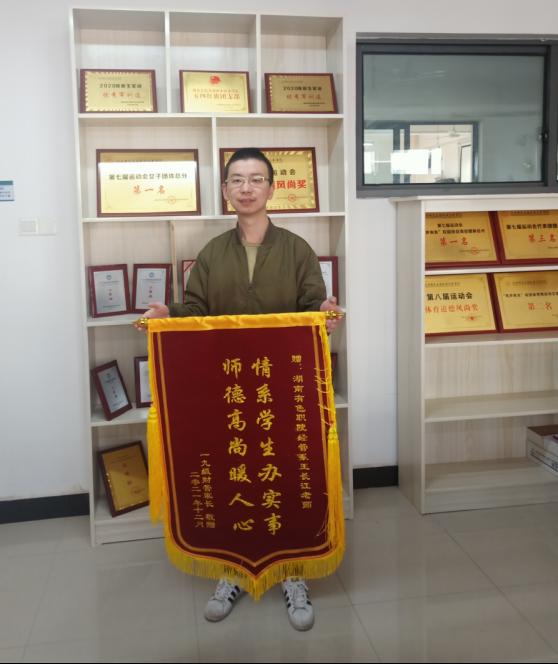 12月10日下午,学生家长将“情系学生办实事、师德高尚暖人心”的锦旗送到经济管理系办公室,以表达对学院和王长江老师千方百计维护学生权益的感谢之情。