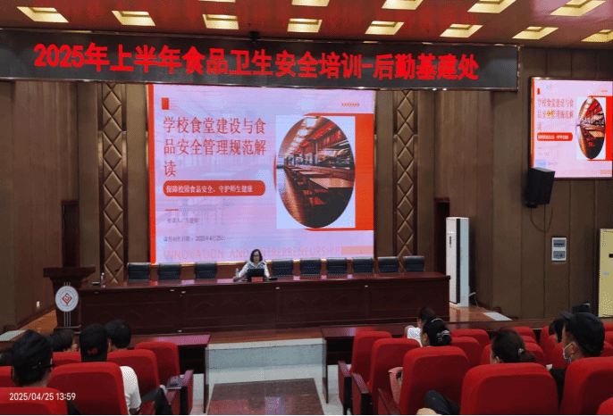 2025年4月25日下午,后勤基建处组织了一次食品卫生安全专题讲座。此次讲座的目的是让相关人员掌握食品卫生安全基本知识,增强食品卫生安全意识,提高食品卫生安全监管能力及卫生安全事故的预防能力。后勤基建处的食堂商铺监管人员、食堂商铺从业人员和学生代表参加了讲座。