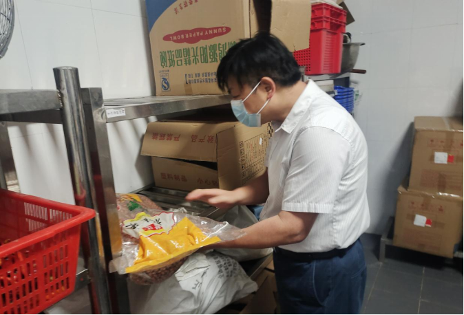 曾维平在食堂查看食品是否过期