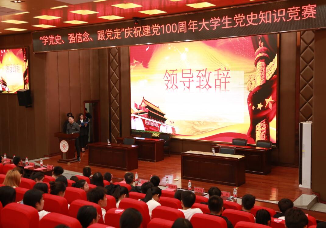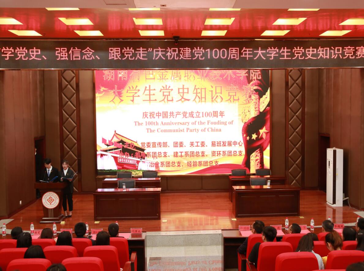 4月28日晚,值五四青年节来临之际,为庆祝建党100周年,重温中国共产党光辉历程,更好地继承和发扬党的优良传统和优良作风,学院宣传统战部、学工处、团委、关工委、易班发展中心在学术报告厅共同举办以“学党史、强信念、跟党走”为主题的大学生党史知识竞赛。学院党委书记许国强,宣传统战部部长闫军礼,学工处处长李彪,机电工程系副主任廖礼鹏,冶金材料系副主任何军,冶金系团总支书记谭帅,机电系团总支书记蒋芙蓉等领导老师莅临本次比赛现场指导。