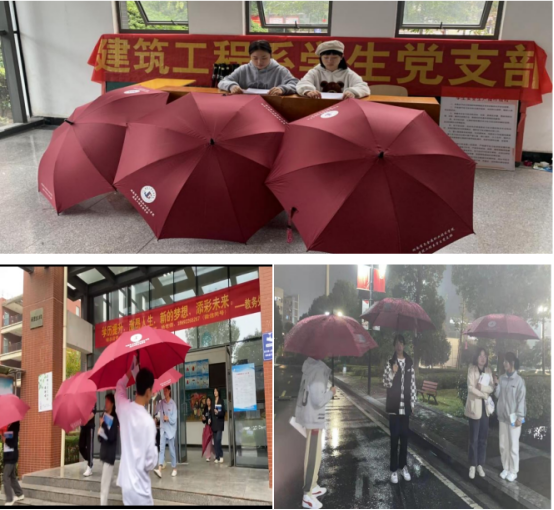 2021年11月,为把党史学习成果转化为“我为师生办实事”的具体实践,解决广大师生及校内工作人员面对突如其来的大雨“急难愁盼”的问题,增强师生们的幸福感和归属感。建筑工程系团总支团学会举办“为党旗增辉,为师生服务”的“小红伞”志愿活动,建工系学生党支部组织学生积极分子成立职院服务队,设立免费雨伞借助点,让大家在下雨天也能感受到一份温暖。(图/文 承湘宇 樊明民)