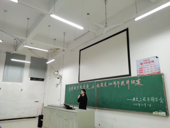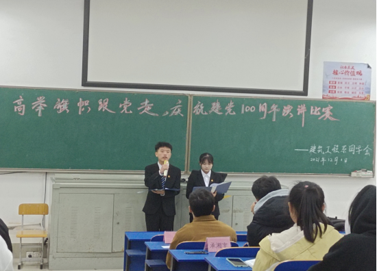 2021年12月1日晚,由建筑工程系学生党支部主办、团总支学生会承办的“高举旗帜跟党走,庆祝建党百周年”主题演讲比赛在2115教室顺利举行。12名选手脱颖而出进入决赛,大赛评委由建工系党总支副书记戴艾、学生工作副主任胡晓、团学会指导老师樊明民以及全体辅导员担任。
