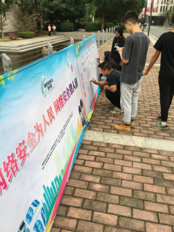 (1)在学院人工湖处摆放签字展板,发起以倡议“绿色上网,从我做起”为主题的师生签名活动,并发放网络安全宣传单。