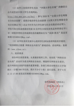 (4)印发了2020年国家网络安全宣传周宣传手册发放至各个系部。主要以个人信息安全防护知识为主,如:伪基站与钓鱼WIFI的防范、移动支付的正确使用、个人信息的安全处理等。