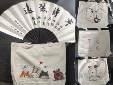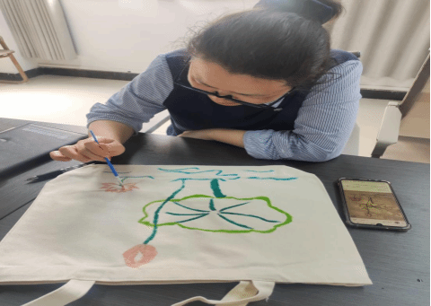 理论学习之后,全体参会人员进行手绘DIY活动。大家在素面团扇、帆布包上认真起笔,细致勾勒,巧手绘图,五彩涂色,将栩栩如生的手绘作品呈现出来。